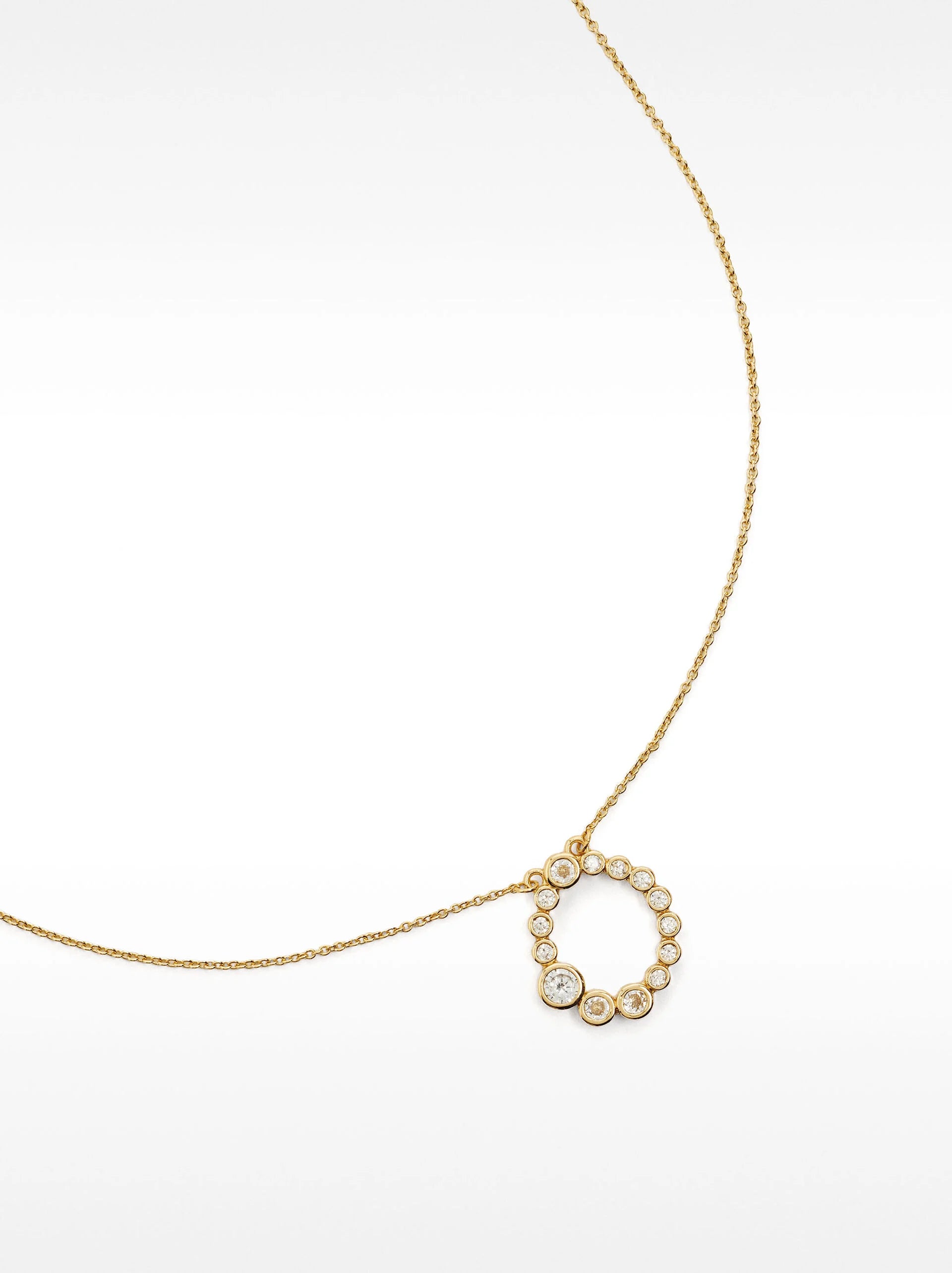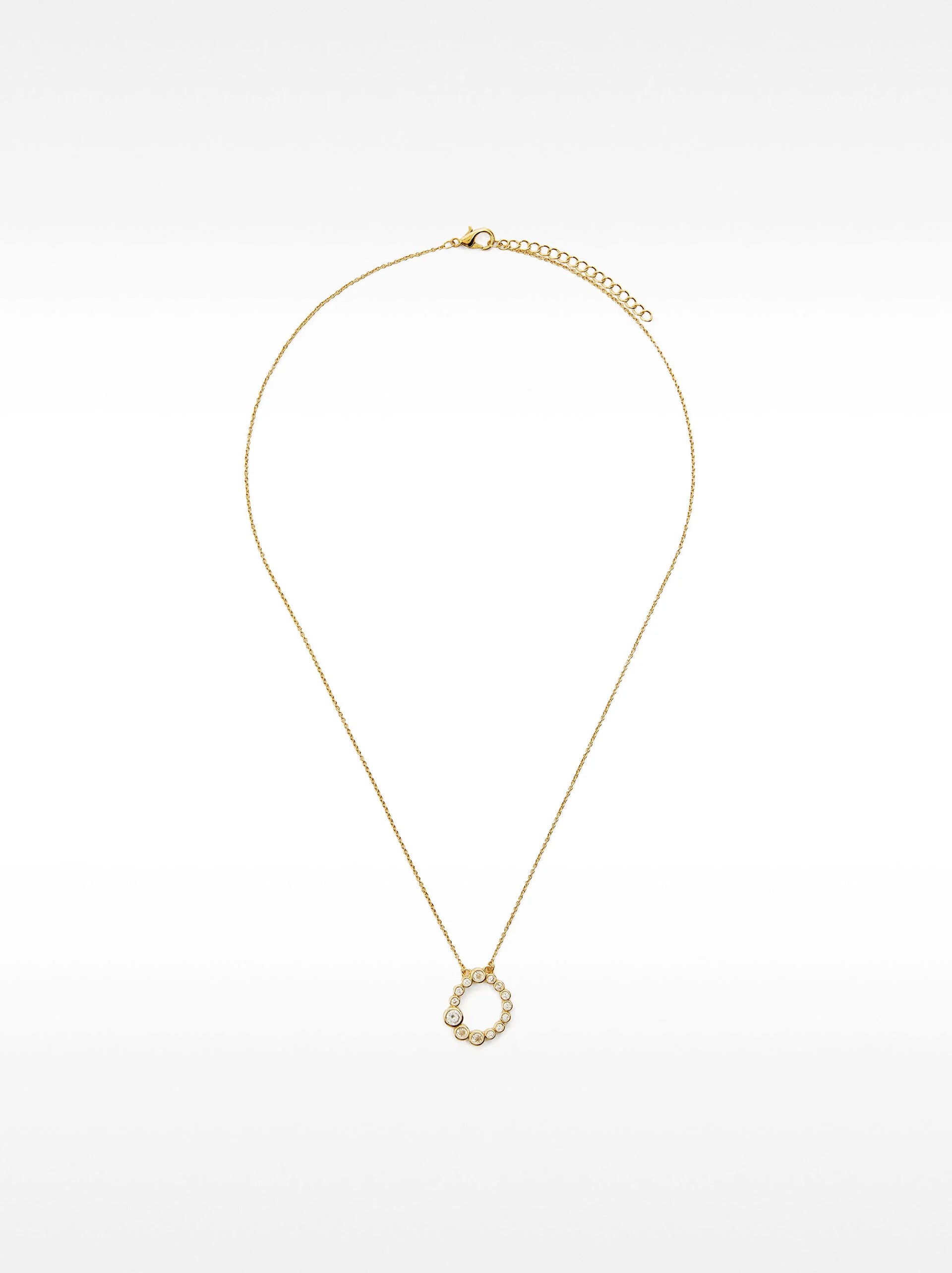 Collar corto de diseño elegante con un colgante en forma de aro adornado con circonitas brillantes, que aportan un toque de sofisticación. Cuenta con un cierre de mosquetón para un ajuste seguro y cómodo. Su acabado dorado le da un aire refinado y versátil, ideal para cualquier ocasión.
