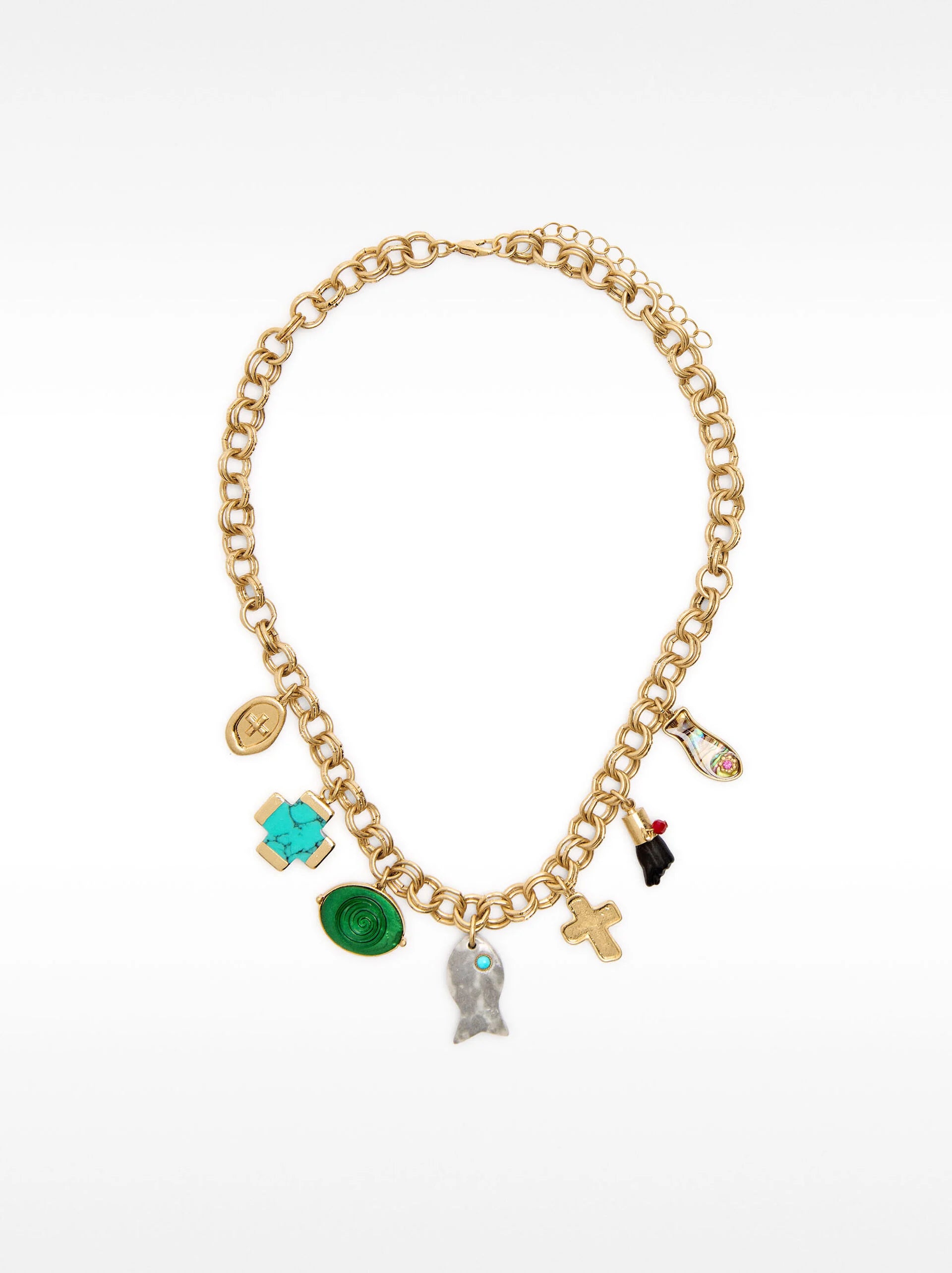 Collar corto de eslabones con un atractivo conjunto de charms esmaltados, de resina y conchas, que incluyen cruces, peces, un ojo, una medalla y un puño. Su diseño ecléctico y lleno de simbolismo aporta un toque único y llamativo. Cuenta con un cierre de mosquetón para mayor seguridad y un acabado dorado que realza su estilo.