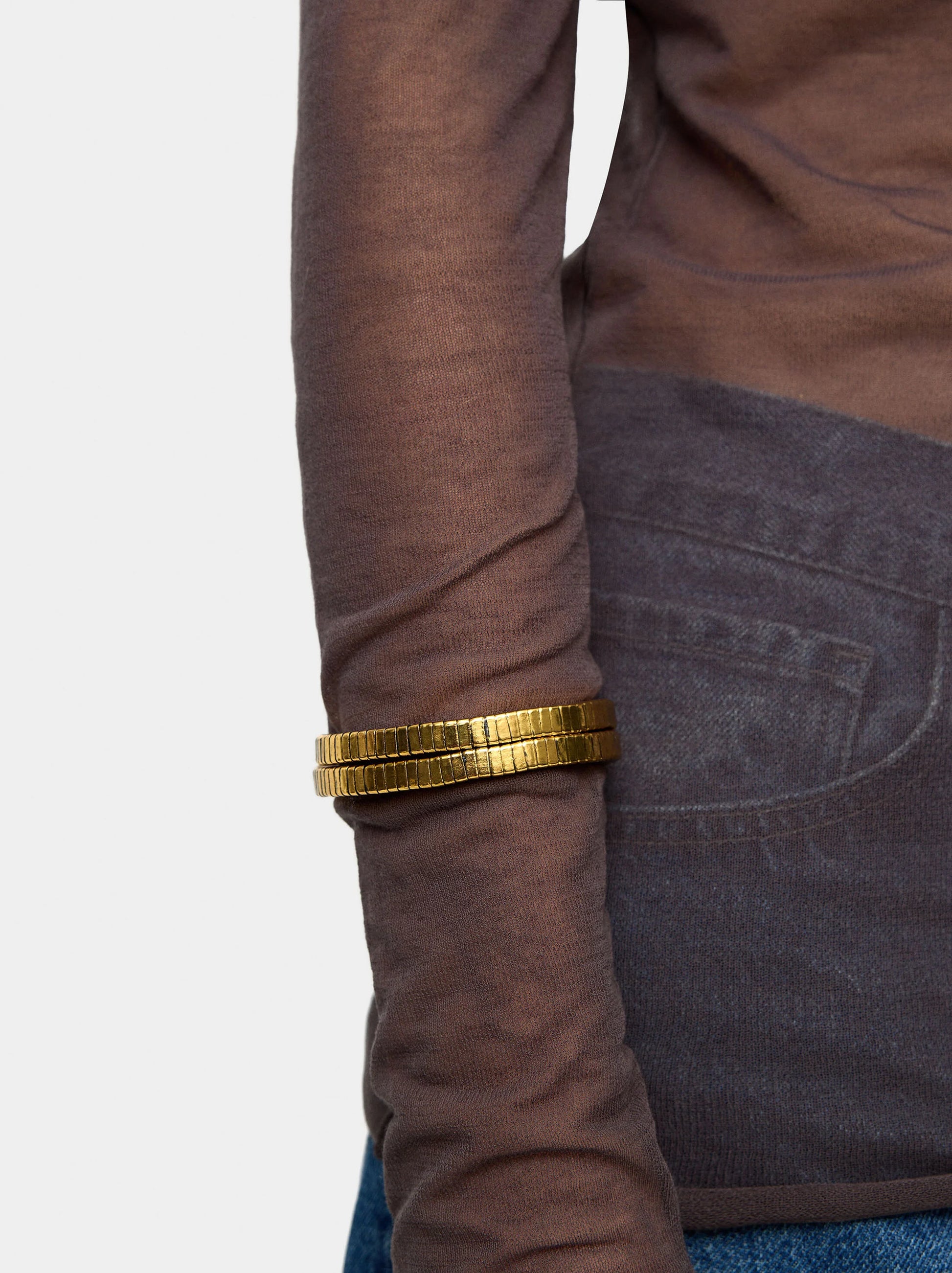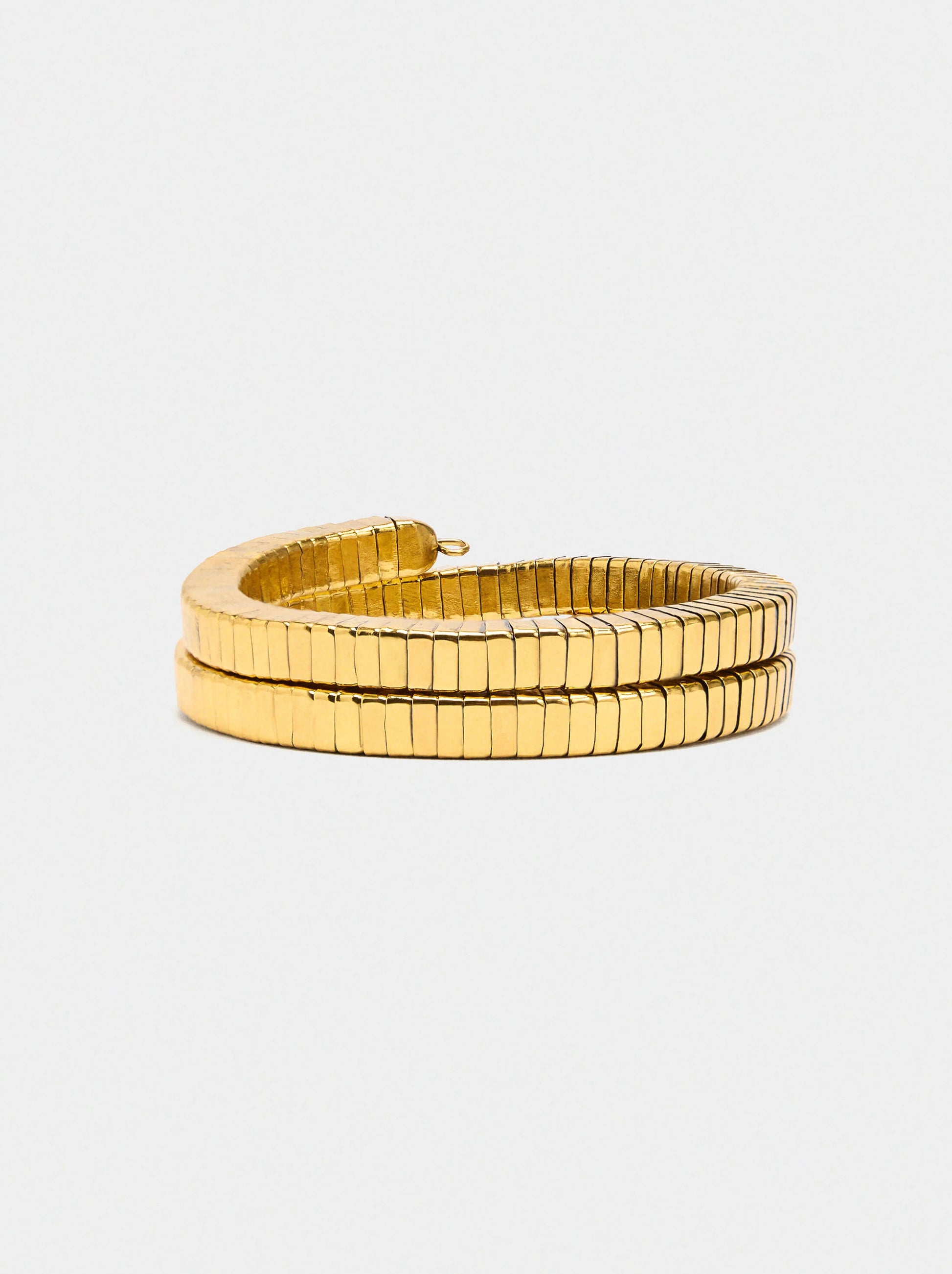 Pulsera en forma de espiral con cuentas cuadradas. Efecto envejecido. Acabado dorado.